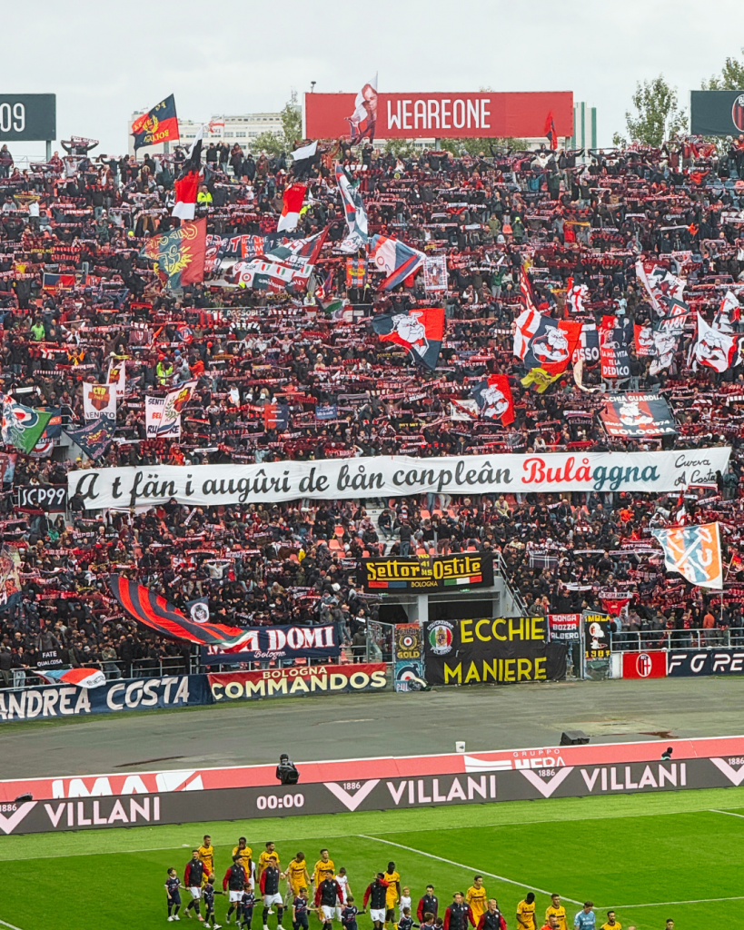 The rain had started hours before kick-off, that persistent autumn drizzle that never quite lets up in northern Italy. It didn’t put anyone off. And why should it. Bologna in the rain is just beautiful, as when the sun is pulsing down on its terracotta landscape. Along Via Andrea Costa, the walk to the Renato Dall’Ara Stadium felt like a quiet pilgrimage. Red and blue scarves hung from shoulders, shop windows, and cafes. Outside small bars, the smell of espresso mixed with traditional pastries and all the while everyone was talking about football. There can’t be many better ways to spend an afternoon than this.