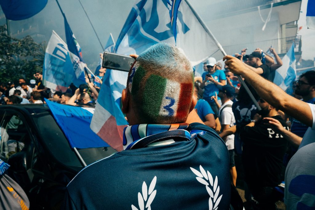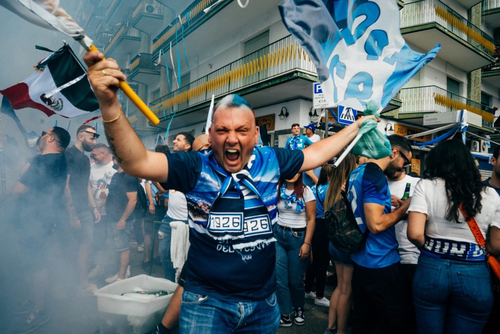 Boogie shoots the world with unfiltered honesty. His images of Naples are alive with the electricity of a city experiencing itself fully: joy, defiance, identity, and release. Bodies climb lampposts, flags swallow entire streets, strangers become family for a night.