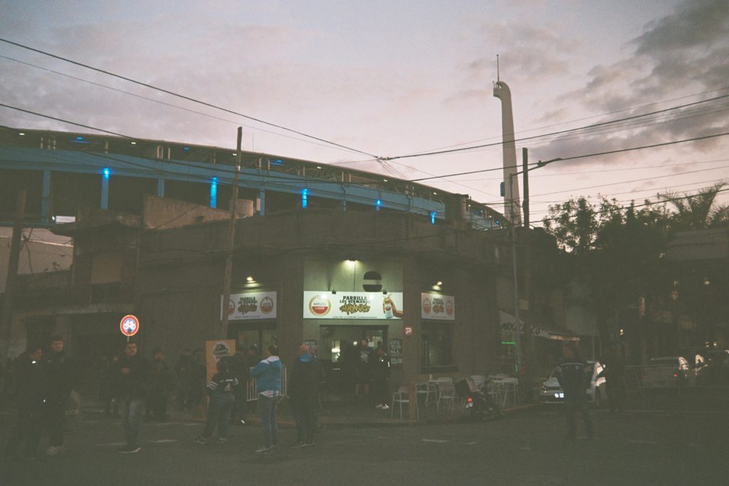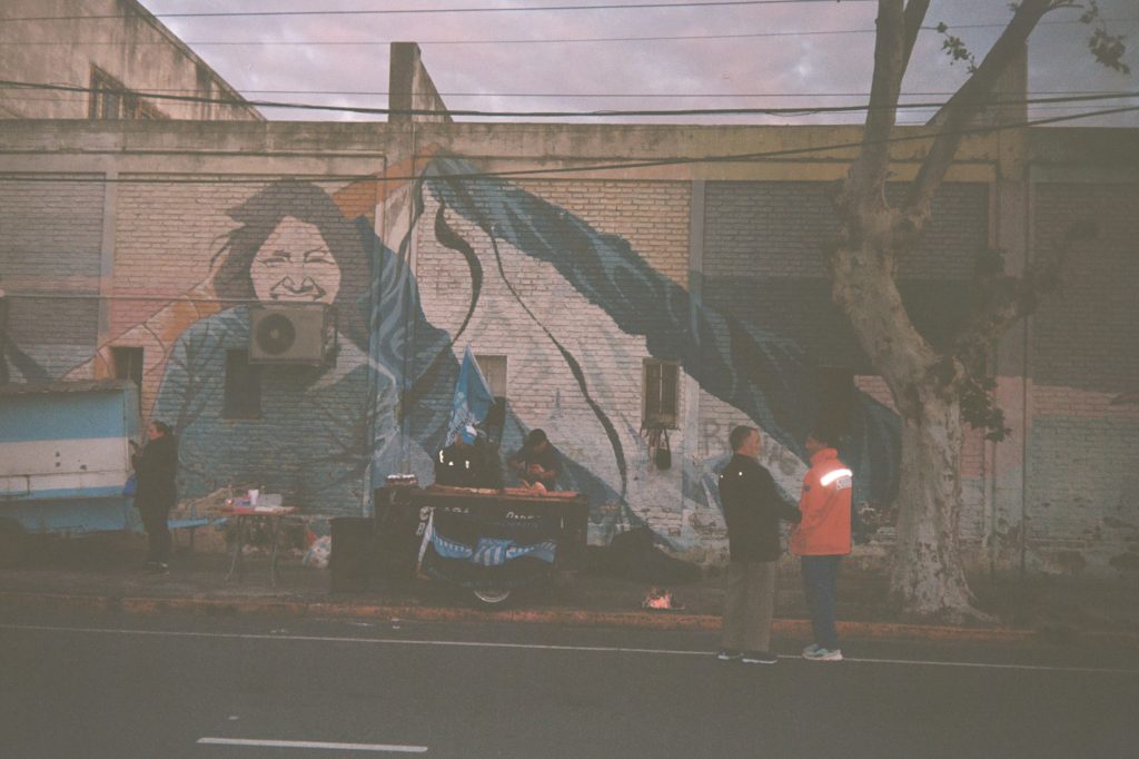 After I cross the bridge, the evening at Racing begins almost symbolically for all these experiences. The floodlit streets around the stadium are lined with open fires where people are grilling, and the now-familiar smell of choripán follows me as I walk toward a small bar at the foot of the Estadio Presidente Perón.